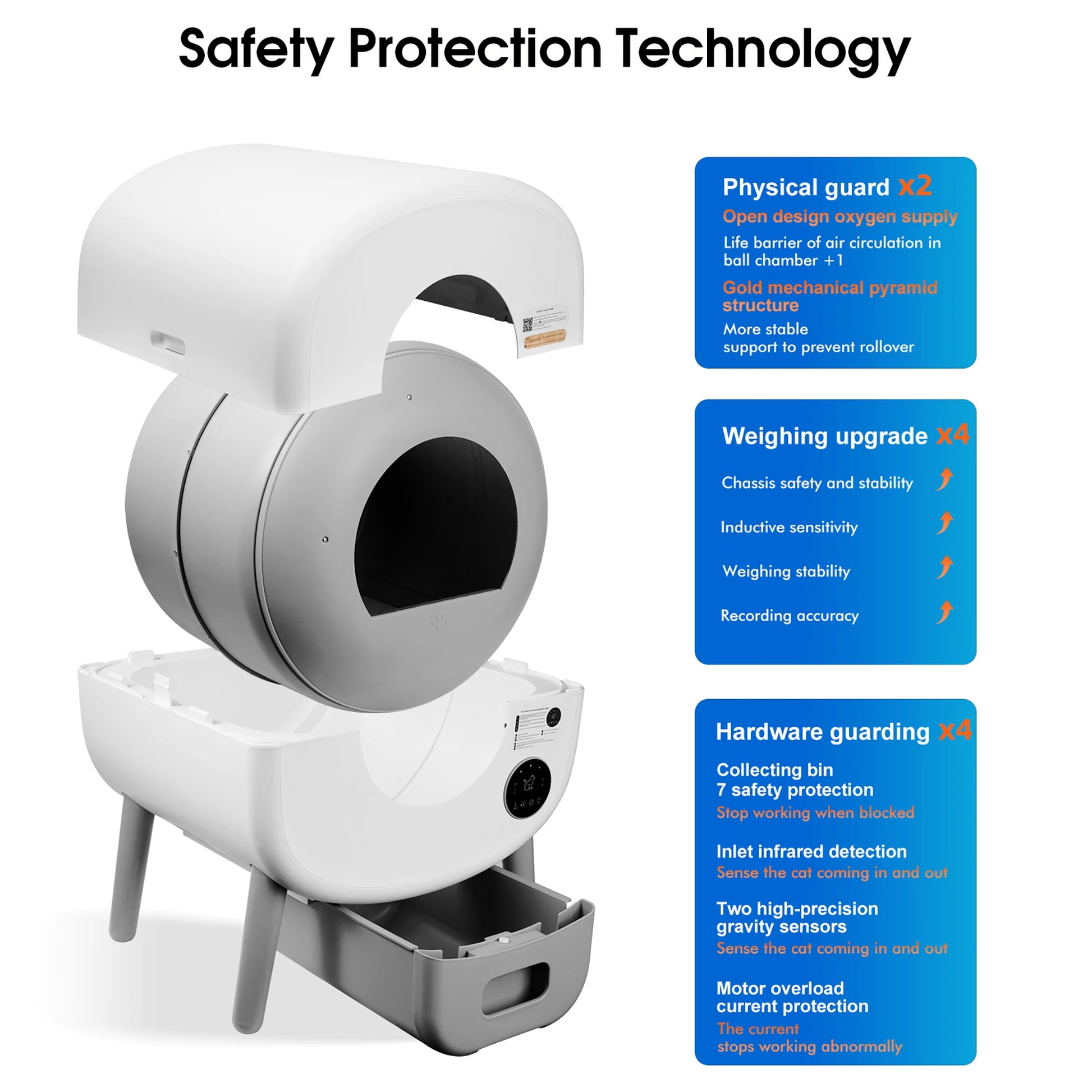 Multiple Anti-pinch: the cat goes up to the litter box will stop rotating; followed by the use of automotive glass material, in order to prevent the cat from being pinched to the cat's secondary protection; at the same time, the cat is close to the cat litter box sensing zone, the doorway has an infrared anti-pinch, even if the bin has seven pairs of infrared in order to prevent being pinched.
